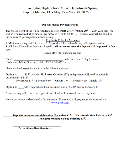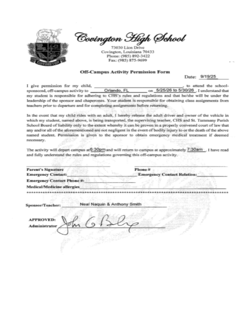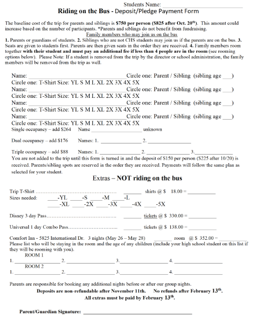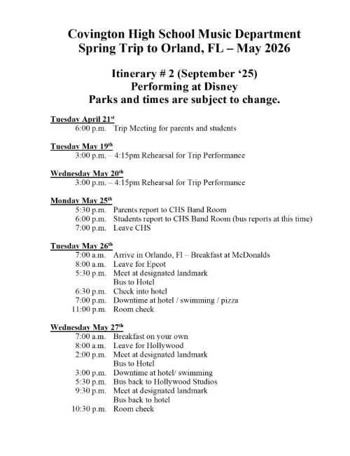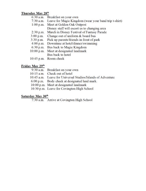 Disney Band Trip 2026 Disney Trip Extras: You MUST PRINT & SIGN this form. It can then be submitted to Mr. Naquin. Trip Extras: Tentative Itinerary